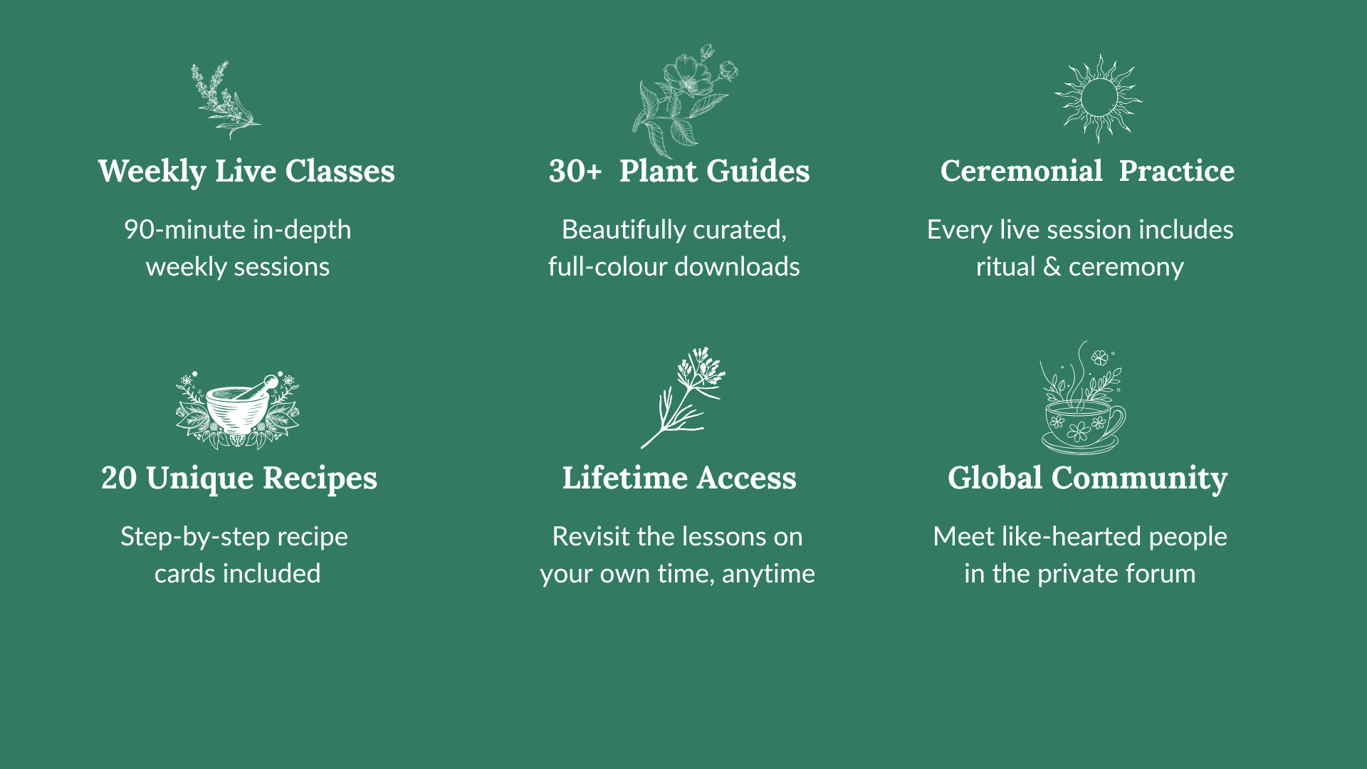 This program is a balance between learning practical, modern herbalism drawn from Seraphina's 20+ years of clinical practice & the wisdom drawn from shamanistic and alchemical traditions she has been steeped in for 30 years. She brings you expertise, wisdom and a profound connection to plants so you can learn a tradition that is deeply rooted in tools you can apply to your own life for your physical, emotional and spiritual healing.
